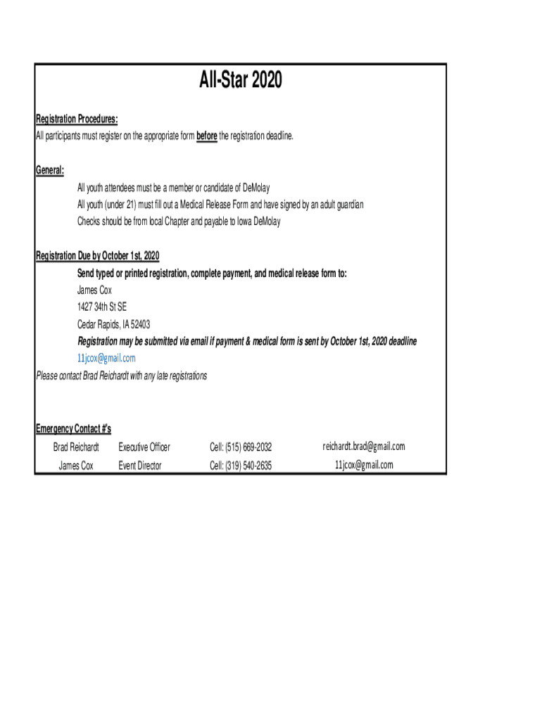 Altar 2020 Registration Procedures: All participants must register on the appropriate form before the registration deadline. General: All youth attendees must be a member or candidate of Demo lay