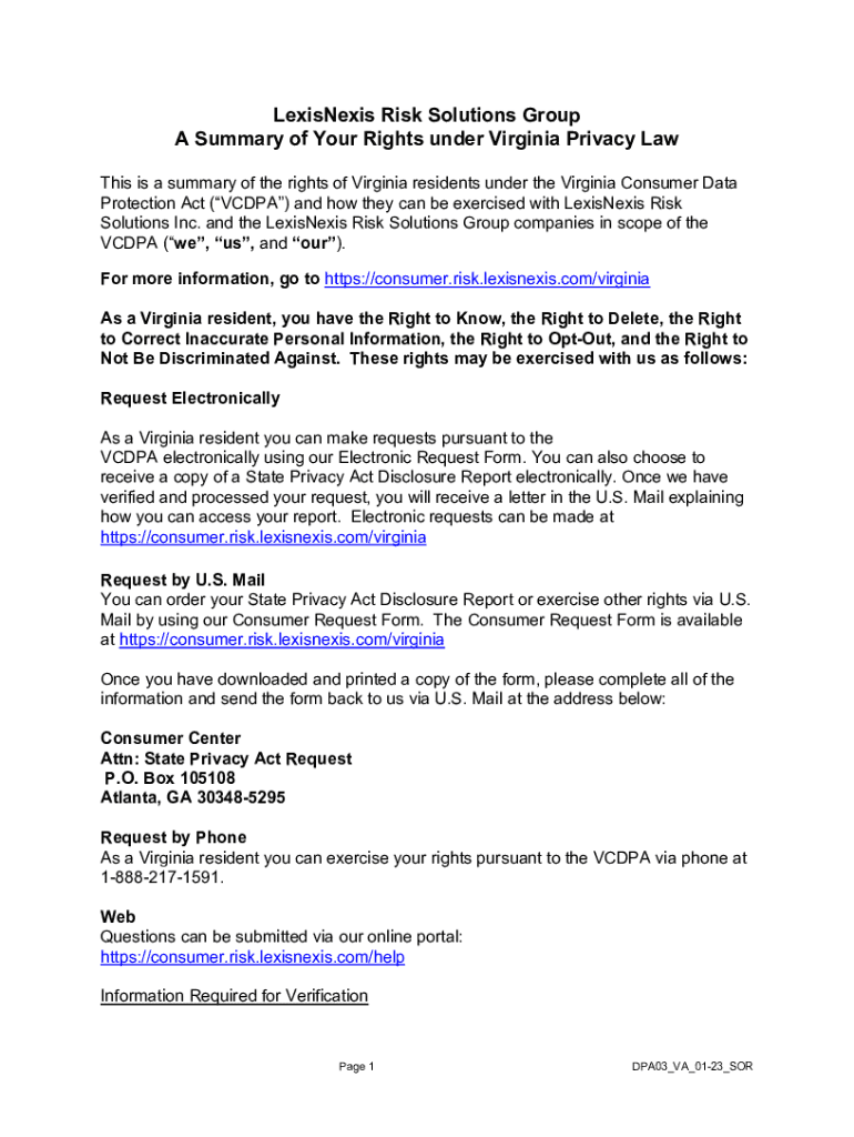 LexisNexis Risk Solutions Group A Summary of Your Rights under Virginia Privacy Law This is a summary of the rights of Virginia residents under the Virginia Consumer Data Protection Act (VC DPA) and