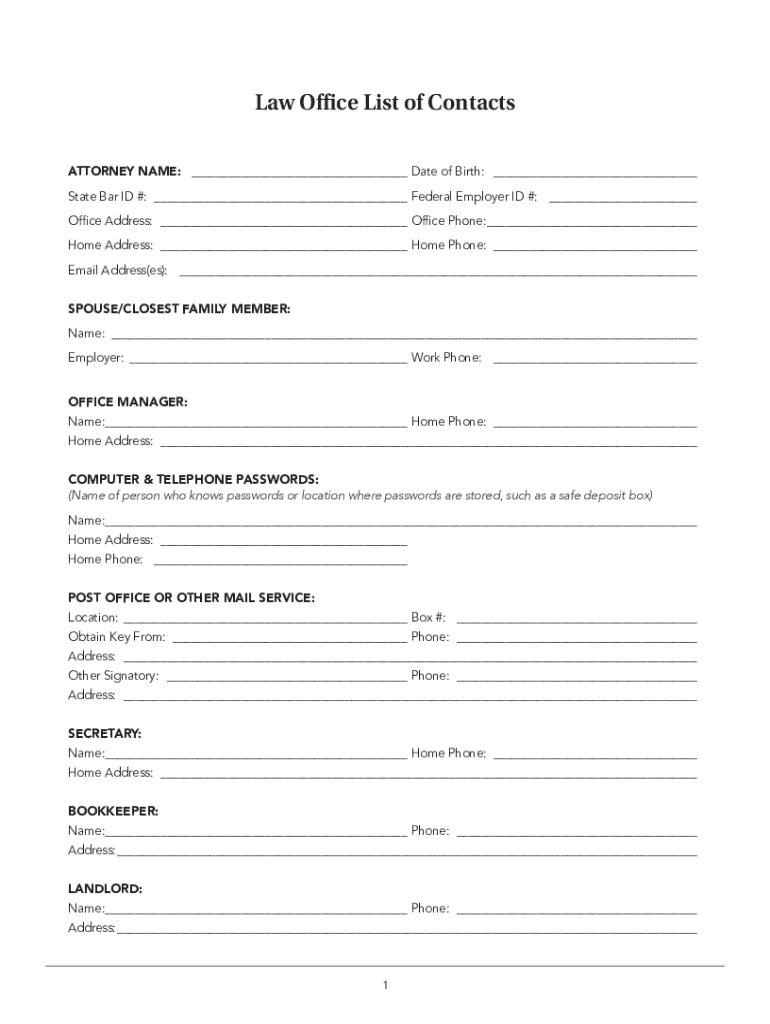 Law Office List of Contacts ATTORNEY NAME: ___ Date of Birth: ___ State Bar ID #: ___ Federal Employer ID #: ___ Office Address: ___ Office Phone:___Home Address: ___ Home Phone: ___Email Address(BS):