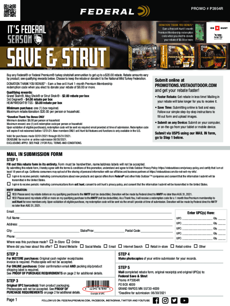 PROMO # P3954RDONATION THANK YOU BONUS* Earn a free on Hunt 1month Premium Membership redemption code when you elect to donate your rebate of $6.00 or more ITS FEDERAL SEASONS AVE & STRUT Buy any