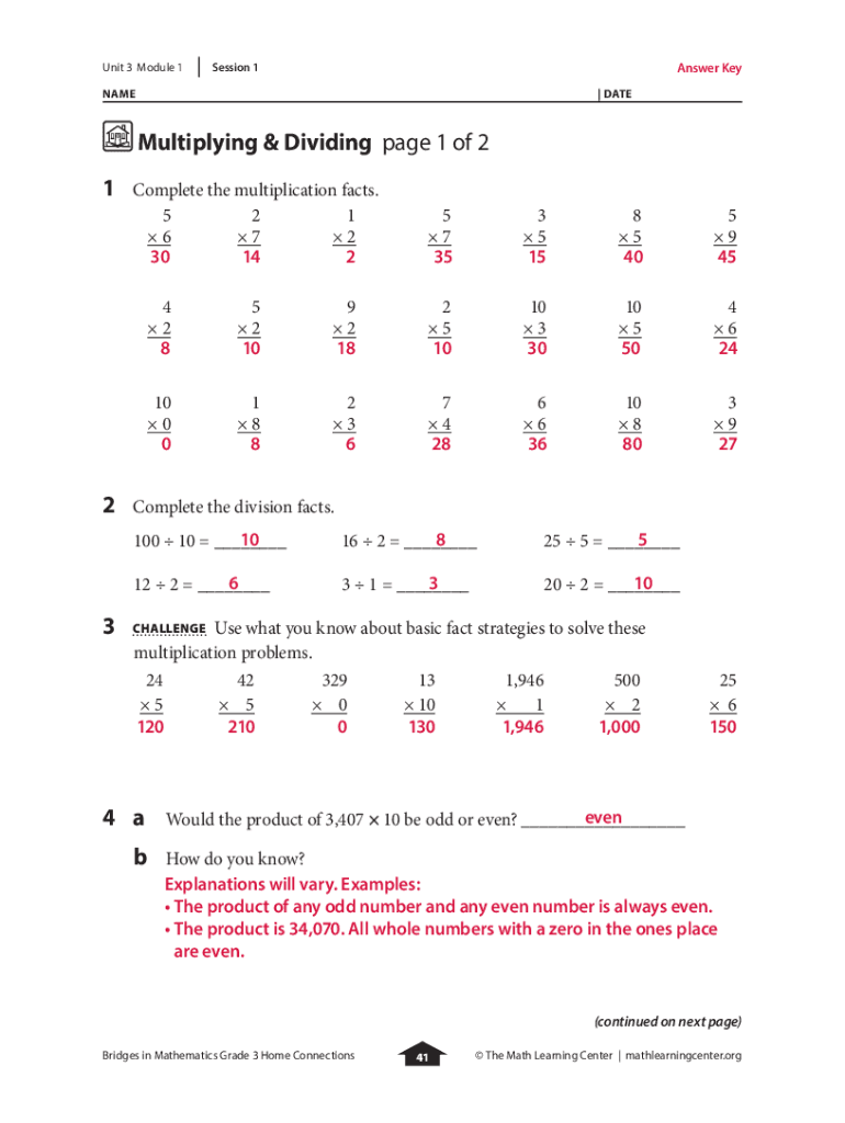Unit 3 Module 1Answer Session 1NAME| DATEMultiplying & Dividing page 1 of 2 123Complete the multiplication facts. 5 2 1 6 7 2 30 14 25 7 353 5 158 5 405 9 454 2 85 2 109 2 182 5 1010 3 3010 5 504
