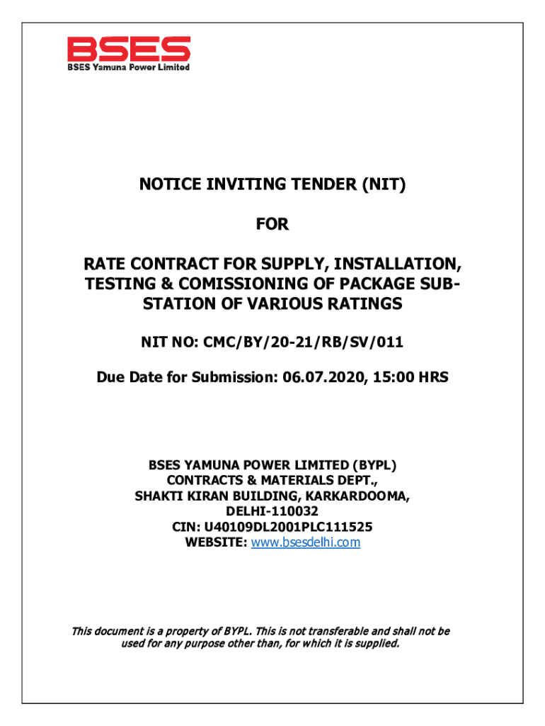 NOTICE INVITING TENDER (NIT) FOR RATE CONTRACT FOR SUPPLY, INSTALLATION, TESTING & COMMISSIONING OF PACKAGE SUBSTATION OF VARIOUS RATINGS NIT NO: CMC/BY/2021/RB/SV/011 Due Date for Submission: 06.07.2020,