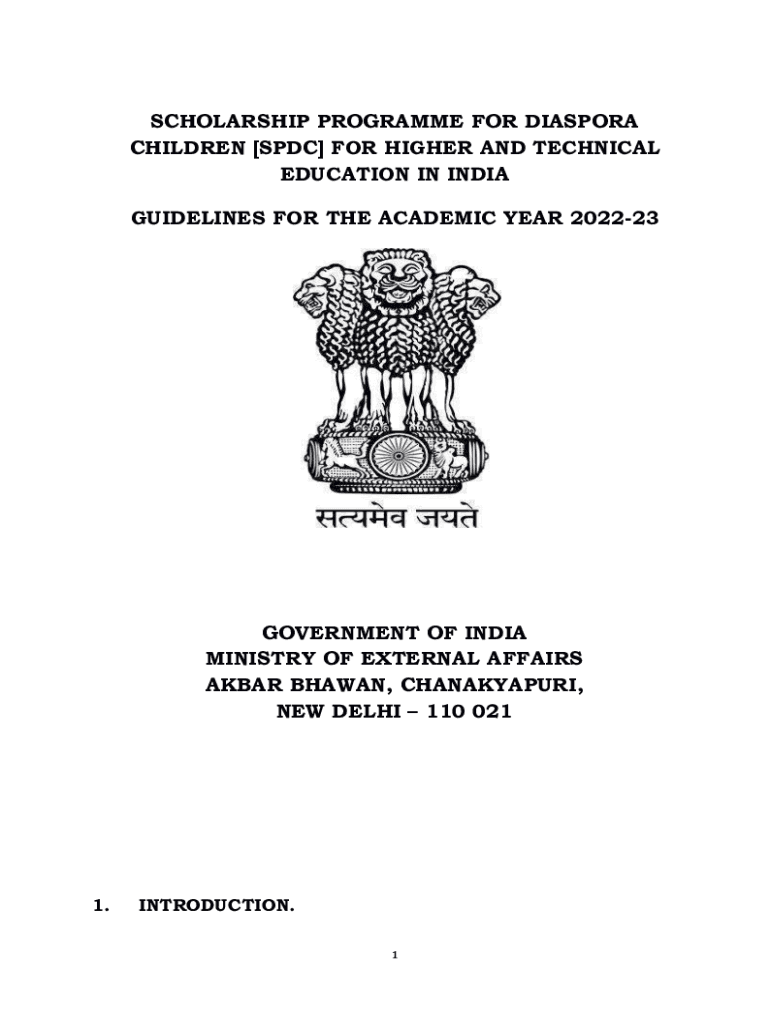 SCHOLARSHIP Program FOR DIASPORA CHILDREN [SPEC] FOR HIGHER AND TECHNICAL EDUCATION IN INDIA GUIDELINES FOR THE ACADEMIC YEAR 202223GOVERNMENT OF INDIA MINISTRY OF EXTERNAL AFFAIRS AKBAR SHAWN, CHANAKYAPURI,