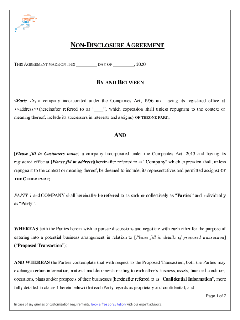 NONDISCLOSURE AGREEMENT THIS AGREEMENT MADE ON THIS ___ DAY OF ___, 2020BY AND BETWEEN Party 1, a company incorporated under the Companies Act, 1956 and having its registered office at address(hereinafter