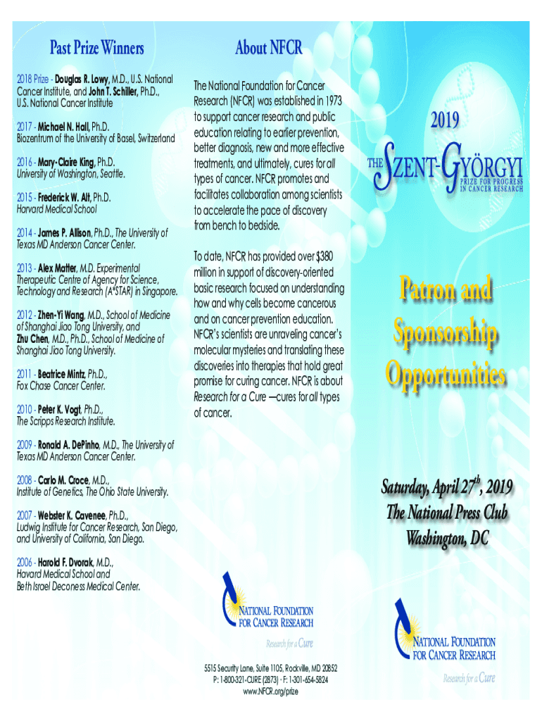 Past Prize Winners 2018 Prize Douglas R. Low, M.D., U.S. National Cancer Institute, and John T. Schiller, Ph.D., U.S. National Cancer Institute 2017 Michael N. Hall, Ph.D. Biocentric of the University
