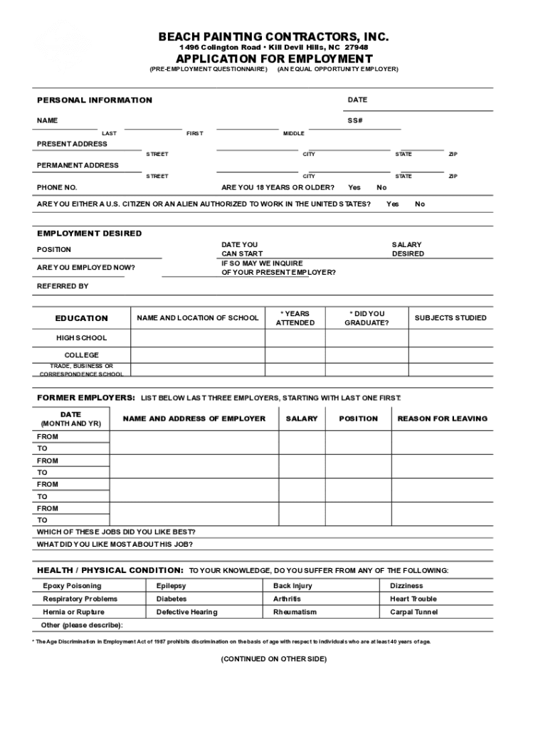 BEACH PAINTING CONTRACTORS, INC. 1496 Covington Road Kill Devil Hills, NC 27948APPLICATION FOR EMPLOYMENT(PREEMPLOYMENT QUESTIONNAIRE)(AN EQUAL OPPORTUNITY EMPLOYER)PERSONAL INFORMATIONDATENAMESS#