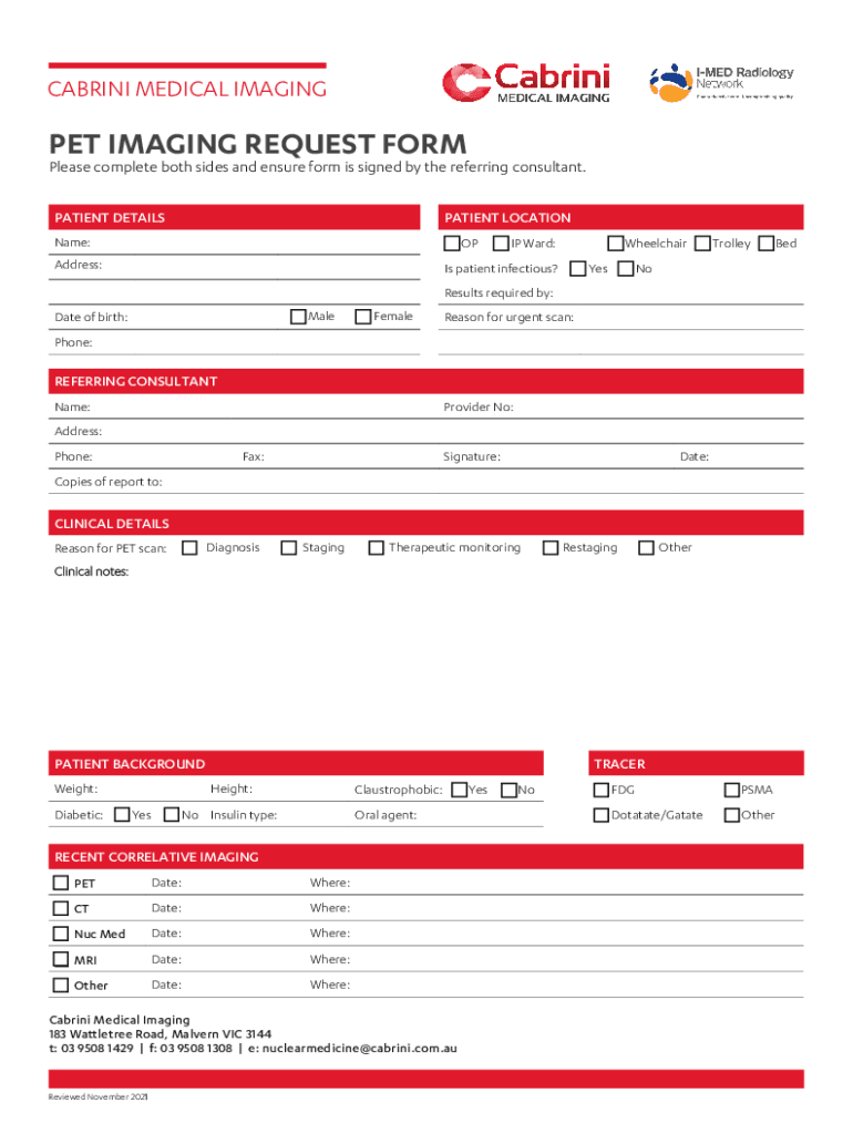 CABRINI MEDICAL IMAGING PET IMAGING REQUEST Formulas complete both sides and ensure form is signed by the referring consultant. PATIENT DETAILSPATIENT Locational: Address:Is patient infectious? Yes