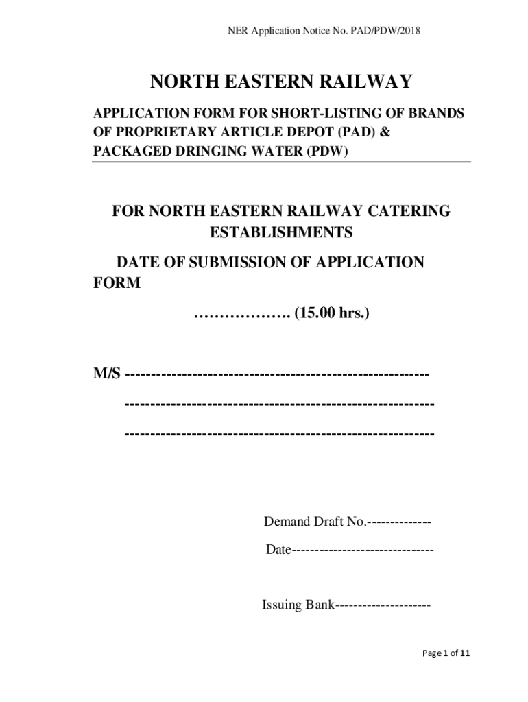 NER Application Notice No. PAD/PD/2018NORTH EASTERN RAILWAY APPLICATION FORM FOR SHORTLISTING OF BRANDS OF PROPRIETARY ARTICLE DEPOT (PAD) & PACKAGED BRINGING WATER (PD)FOR NORTH EASTERN RAILWAY CATERING