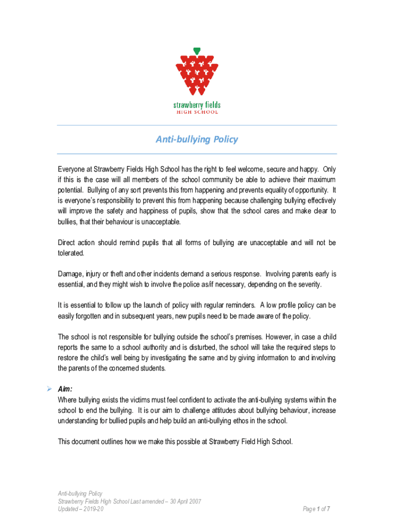 Get the free Anti-bullying Policy - Strawberry Fields High School