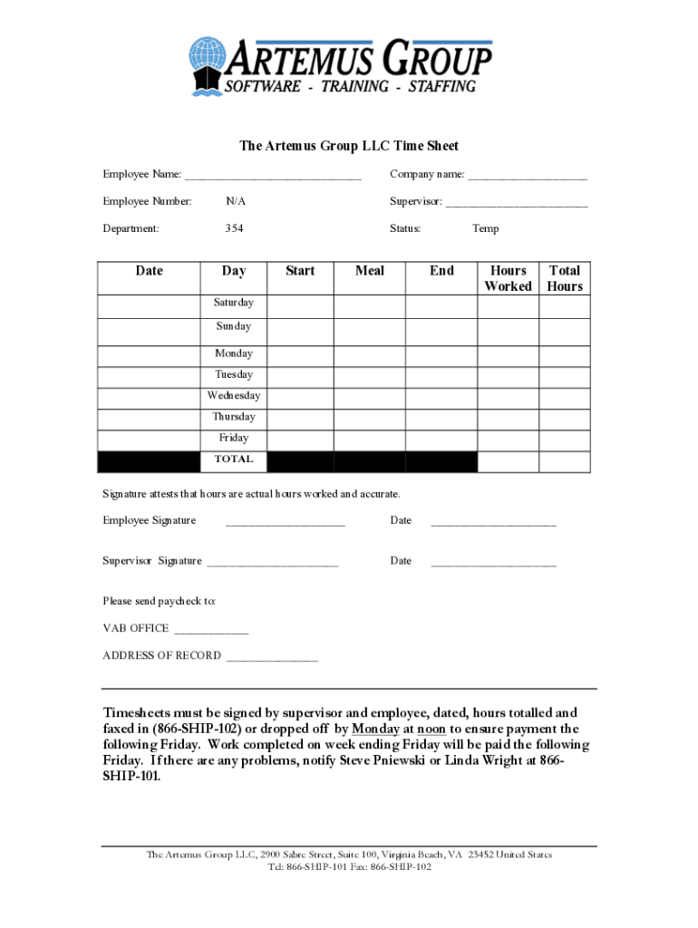 The Artemis Group LLC Time Sheet Employee Name: ___Company name: ___Employee Number:N/Supervisor: ___Department:354Status:DateDayStartMealTempEndHours WorkedTotal Hours Saturday Sunday Monday Tuesday