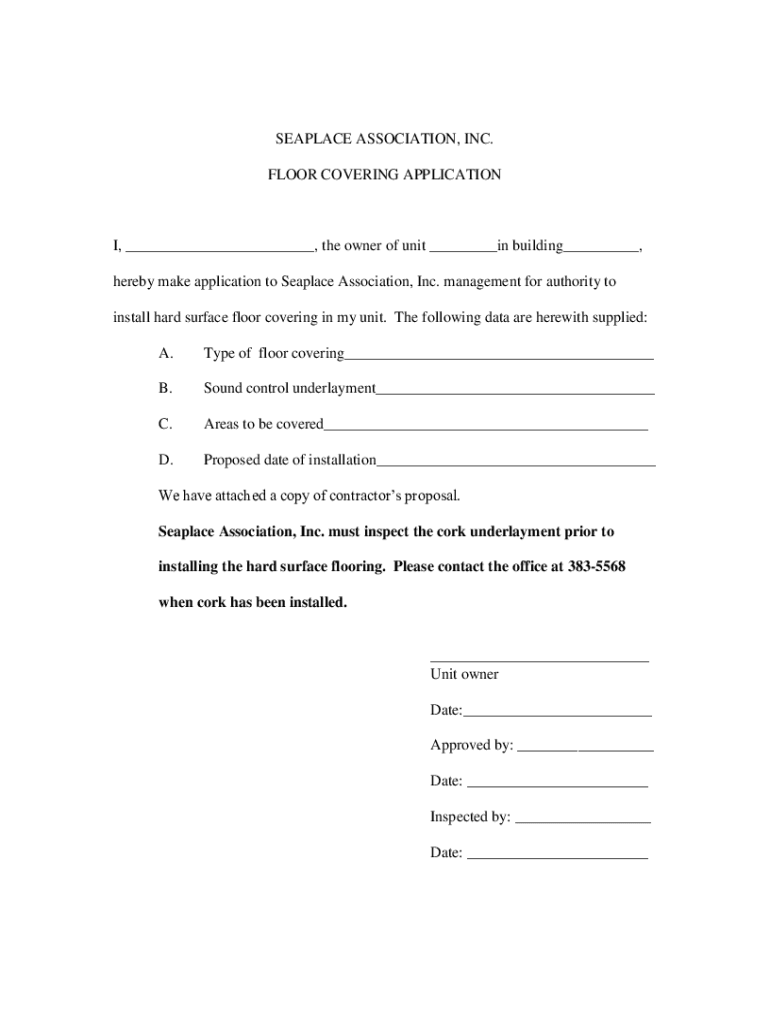 SEAPLANE ASSOCIATION, INC. FLOOR COVERING APPLICATION, ___, the owner of unit ___in building___, hereby make application to Seaplane Association, Inc. management for authority to install hard surface