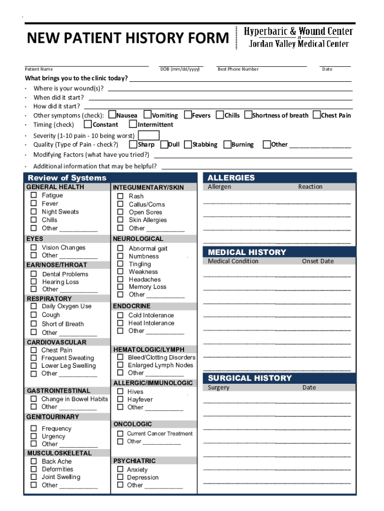 To fill out the new patient history form, the patient must provide accurate information about their medical history, current symptoms, any medications they are taking, and any allergies they may have.