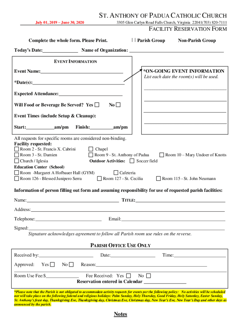 ST. ANTHONY OF PADUA CATHOLIC CHURCH July 01, 2019, June 30, 20203305 Glen Carly Road Falls Church, Virginia 22041(703) 8207111FACILITY RESERVATION FORM Complete the whole form. Please Print. Parish