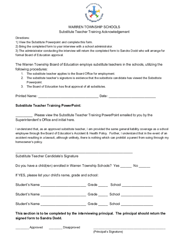 WARRENTOWNSHIPSCHOOLS SubstituteTeacherTrainingAcknowledgement Directions: 1)ViewtheSubstitutePowerpointandcompletethisform. 2)Bringthecompletedformtoyourinterviewwithaschooladministrator. 3)TheadministratorconductingtheinterviewwillreturnthecompletedformtoSandraDoddwhowillarrangefor