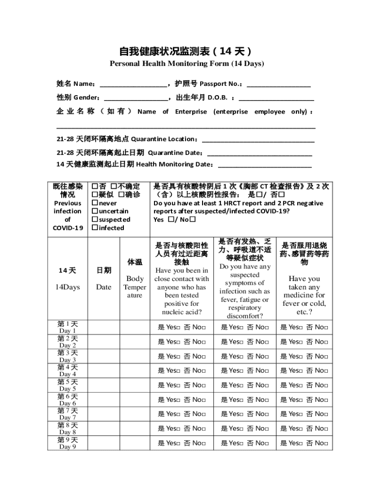 14 Personal Health Monitoring Form (14 Days) Name___ Passport No.___ Gender___ D.O.B. ___ Name of Enterprise (enterprise employee only) ___ 2128 Quarantine Location___ 2128 Quarantine Date___ 14 Health