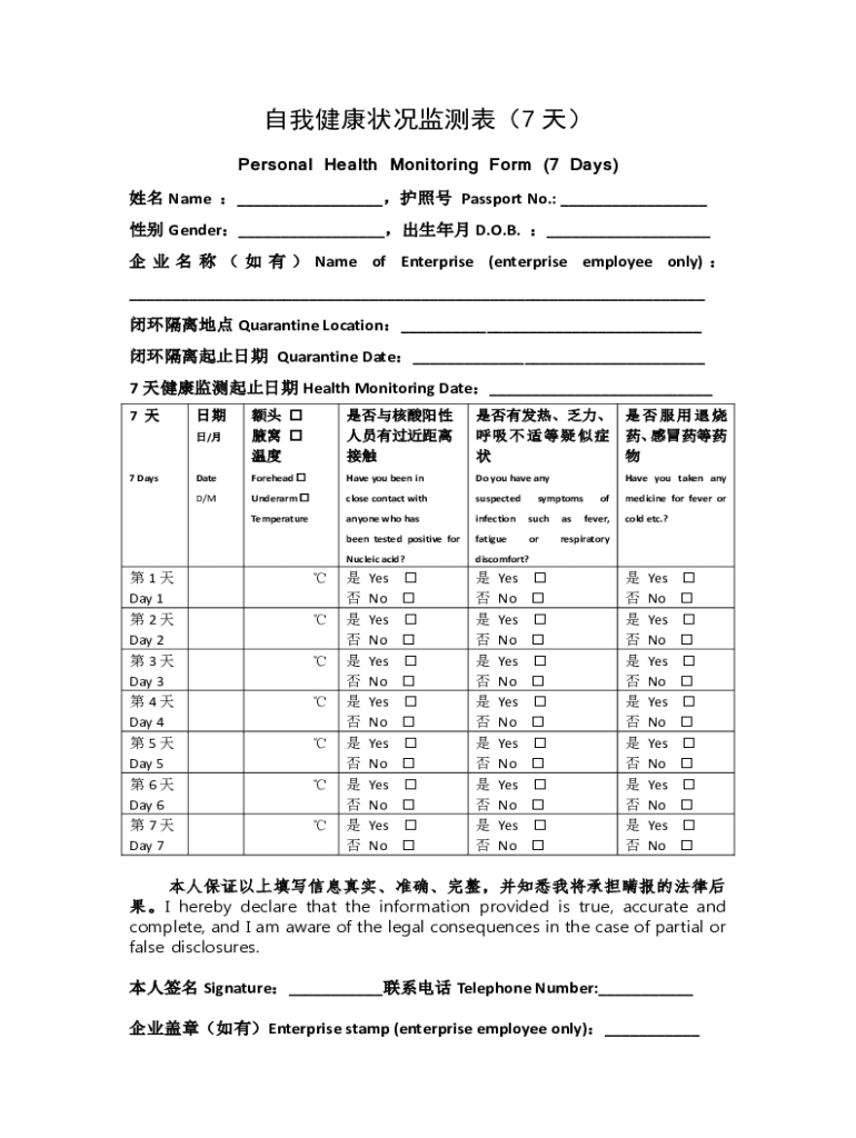 7 Personal Health Monitoring Form (7 Days) Name ___ Passport No.: ___ Gender___ D.O.B. ___ Name of Enterprise (enterprise employee only) ___ Quarantine Location___ Quarantine Date___ 7 Health Monitoring