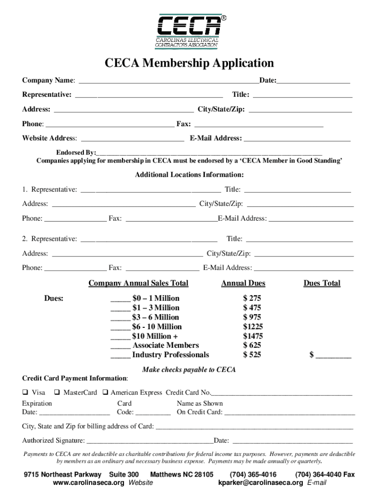 CECA Membership Application Company Name: ___Date:___ Representative: ___Title: ___Address: ___ City/State/Zip: ___ Phone: ___ Fax: ___ Website Address: ___ Email Address: ___ Endorsed By:___ Companies