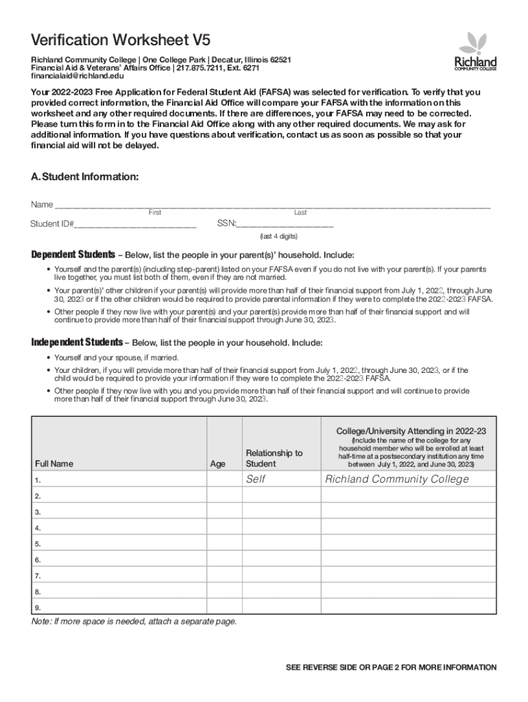 To fill out the verification worksheet v5richland community, students must provide accurate financial information and complete all required sections of the form.