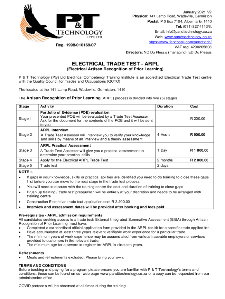 Reg. 1998/010169/07January 2021 V2 Physical: 141 Lamp Road, Vaudeville, Hermiston Postal: P 0 Box 7104, Albemarle, 1410 Tells: (011) 827 4113/6. Email: info@pandttechnology.co.za Web: www.pandttechnology.co.za