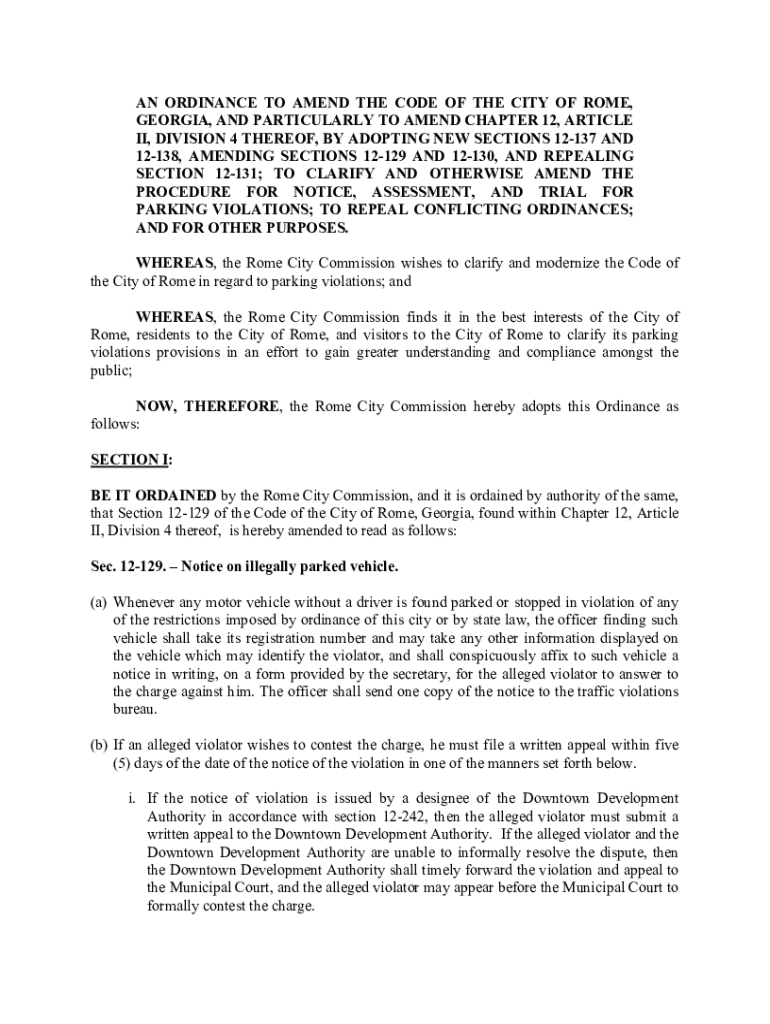 AN ORDINANCE TO AMEND THE CODE OF THE CITY OF ROME, GEORGIA, AND PARTICULARLY TO AMEND CHAPTER 12, ARTICLE II, DIVISION 4 THEREOF, BY ADOPTING NEW SECTIONS 12137 AND 12138, AMENDING SECTIONS 12129
