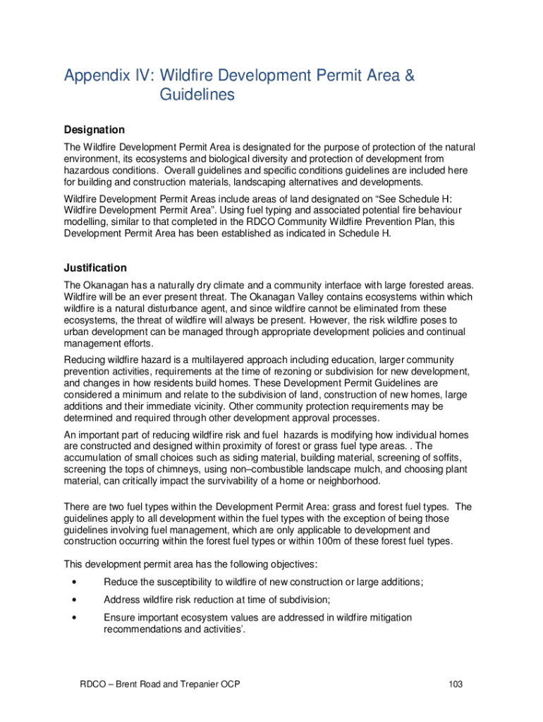 Appendix IV: Wildfire Development Permit Area & Guidelines Designation The Wildfire Development Permit Area is designated for the purpose of protection of the natural environment, its ecosystems and