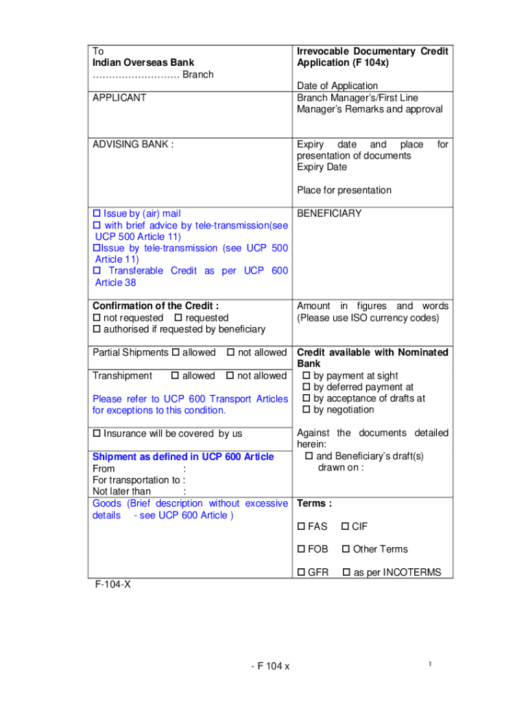 To Indian Overseas Bank BranchIrrevocable Documentary Credit Application (F 104x) Date of Application Branch Managers/First Line Managers Remarks and approvalAPPLICANTADVISING BANK :Expiry date and