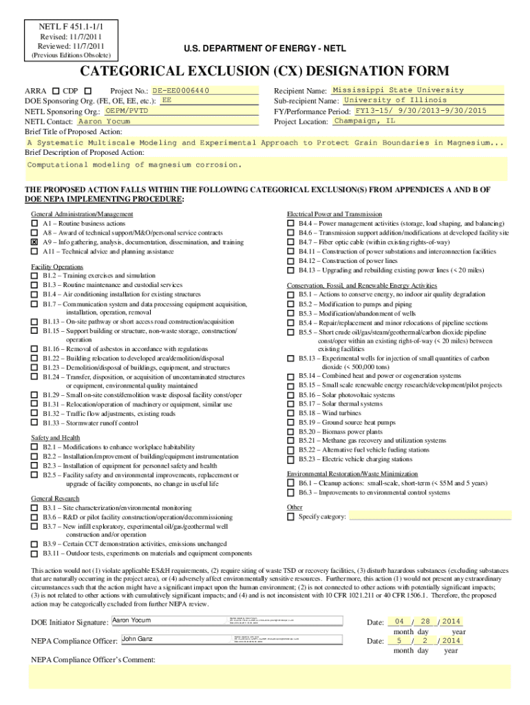 NET F 451.11/1 Revised: 11/7/2011 Reviewed: 11/7/2011 (Previous Editions Obsolete)U.S. DEPARTMENT OF ENERGY NETLCATEGORICAL EXCLUSION (CX) DESIGNATION FORM AREA CDP Project No.: DEEE0006440 Recipient