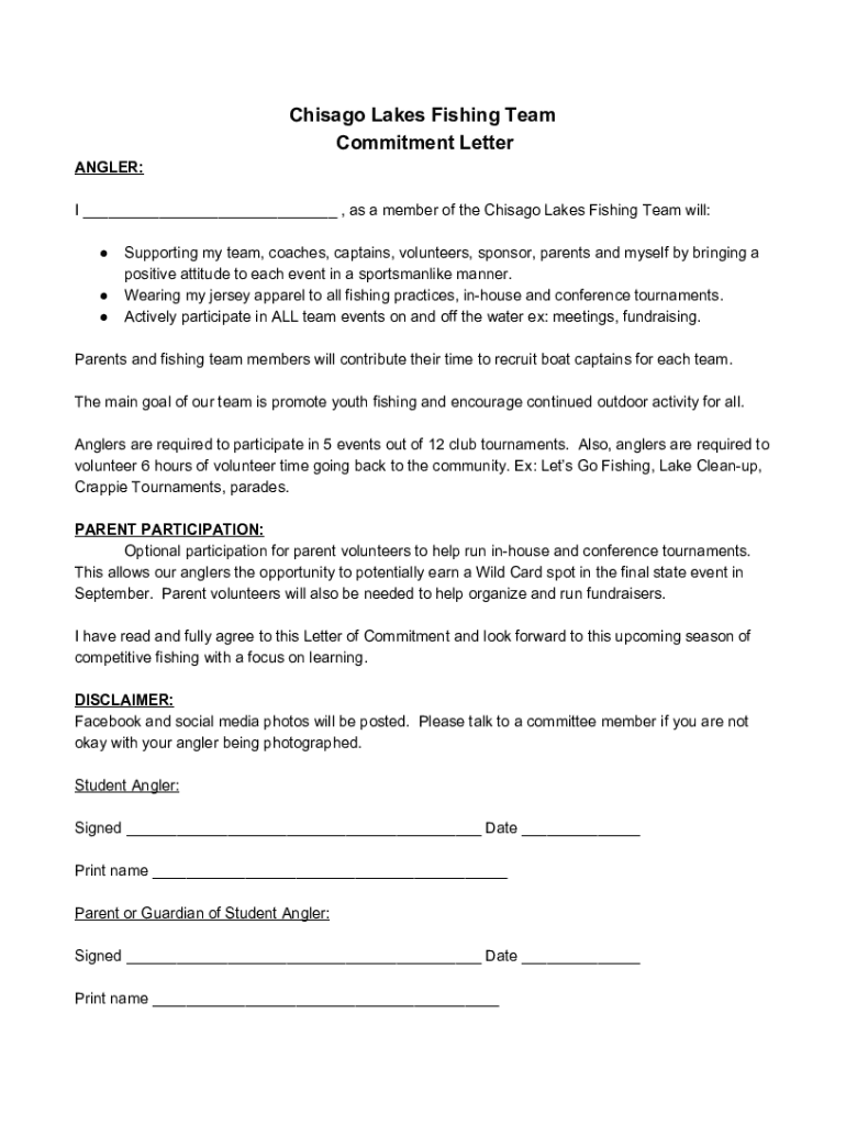Chicago Lakes Fishing Team Commitment Letter ANGLER: I ___, as a member of the Chicago Lakes Fishing Team will: Supporting my team, coaches, captains, volunteers, sponsor, parents and myself by bringing