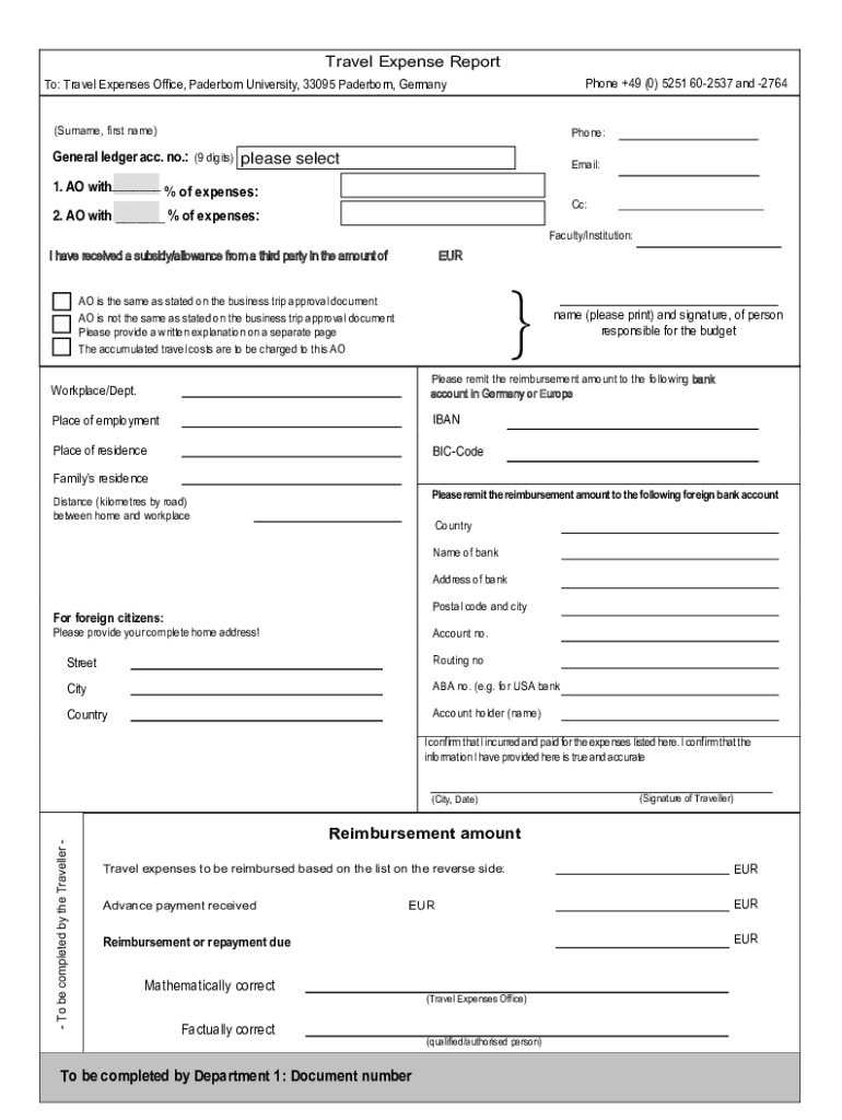Travel Expense Report Phone +49 (0) 5251 602537 and 2764To: Travel Expenses Office, Paderborn University, 33095 Paderborn, Germany (Surname, first name)Phone:General ledger acc. no.: (9 digits) please