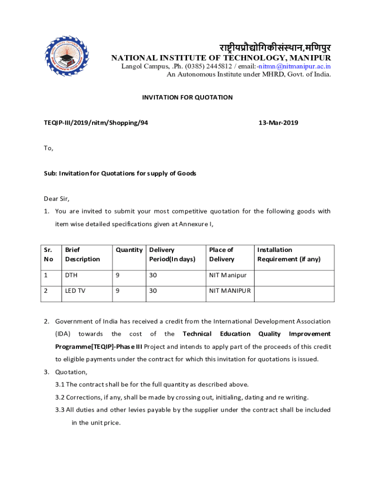 , NATIONAL INSTITUTE OF TECHNOLOGY, MANIPUR Angel Campus, pH. (0385) 2445812 / email:nitmn@nitmanipur.ac.in An Autonomous Institute under MHD, Govt. of India. INVITATION FOR QUOTATION TEQIPIII/2019/Nita/Shopping/9413Mar2019To,