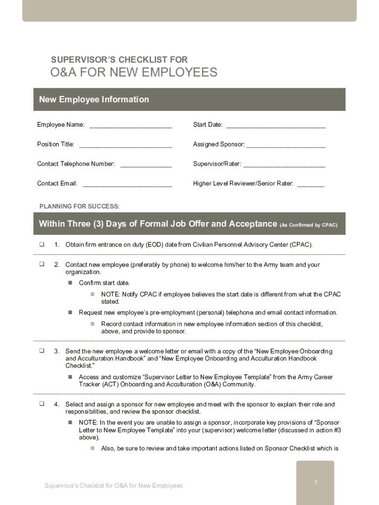 4BSUPERVISORS CHECKLIST FORMOSA FOR NEW EMPLOYEES New Employee Information Employee Name: ___Start Date: ___Position Title: ___Assigned Sponsor: ___Contact Telephone Number: ___Supervisor/Rater: ___Contact