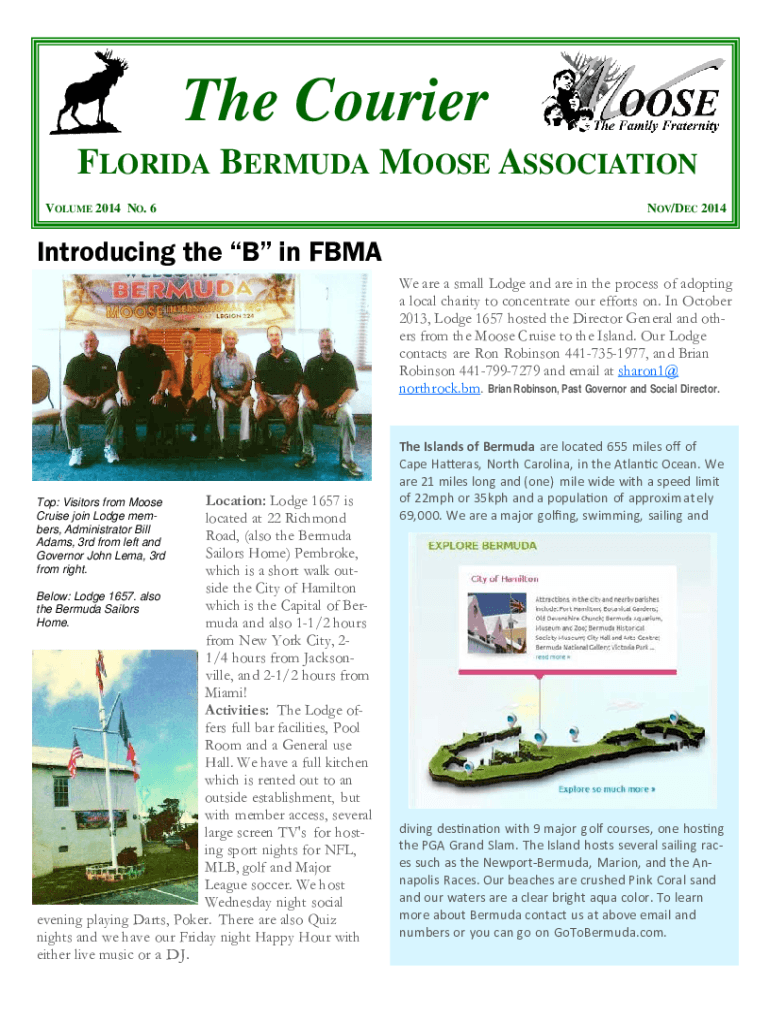 The Courier FLORIDA BERMUDA MOOSE ASSOCIATION VOLUME 2014 NO. 6NOV/DEC 2014Introducing the B in BMA We are a small Lodge and are in the process of adopting a local charity to concentrate our efforts