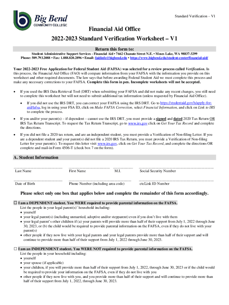 Standard Verification V1Financial Aid Office 20222023 Standard Verification Worksheet V1 Return this form to: Student Administrative Support Services Financial Aid 7662 Canute Street N.E. Moses Lake,