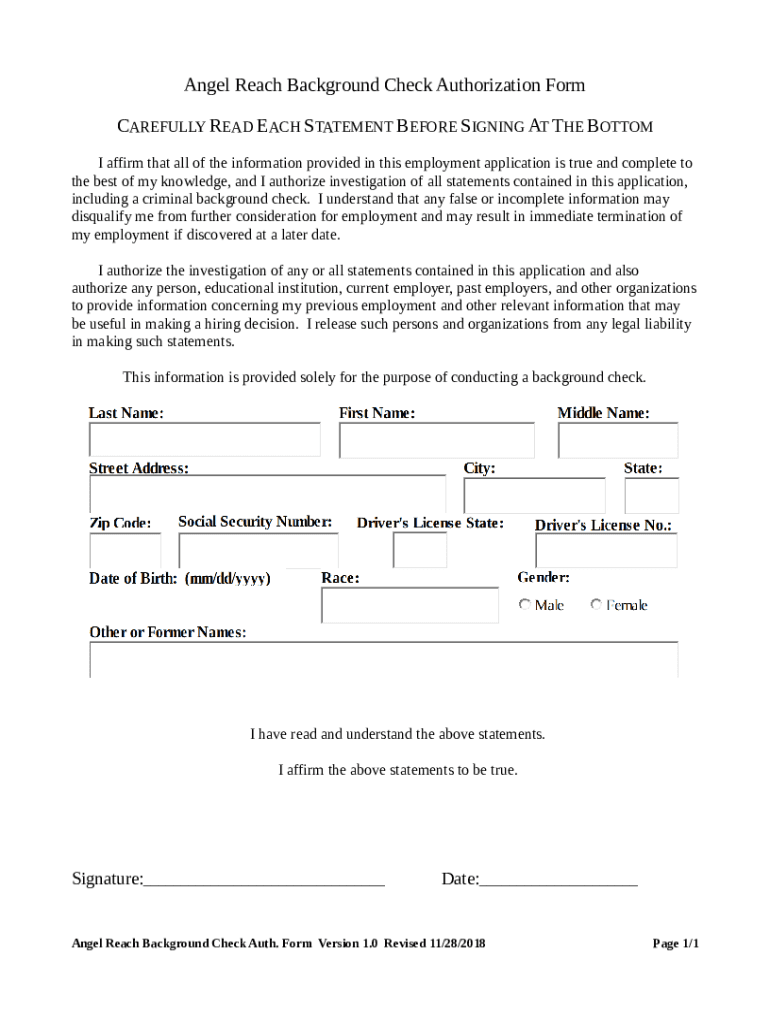 Angel Reach Background Check Authorization Form CAREFULLY READ EACH STATEMENT BEFORE SIGNING AT THE BOTTOM I affirm that all the information provided in this employment application is true and complete