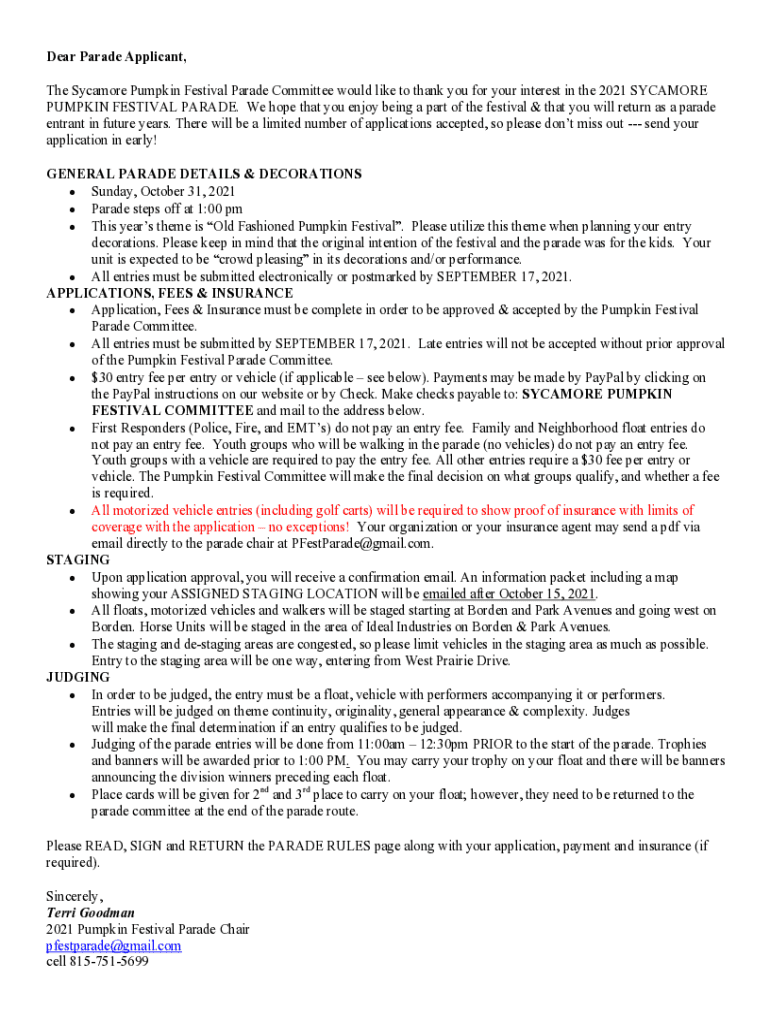Dear Parade Applicant, The Sycamore Pumpkin Festival Parade Committee would like to thank you for your interest in the 2021 SYCAMORE PUMPKIN FESTIVAL PARADE. We hope that you enjoy being a part of