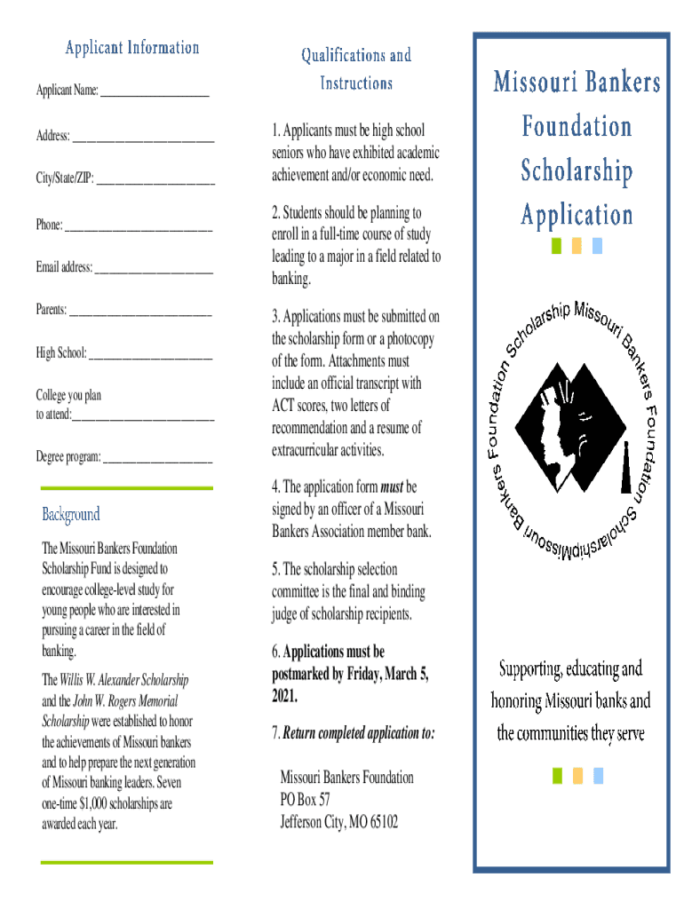 Applicant Name: ___ Address: ___ City/State/ZIP: ___ Phone: ___ Email address: ___ Parents: ___ High School: ___ College you plan to attend:___ Degree program: ___The Missouri Bankers Foundation Scholarship