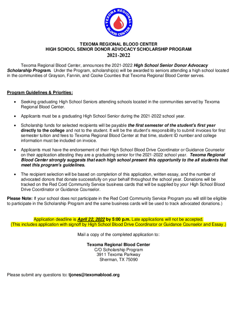 TACOMA REGIONAL BLOOD CENTER HIGH SCHOOL SENIOR DONOR ADVOCACY SCHOLARSHIP PROGRAM20212022 Tacoma Regional Blood Center, announces the 20212022 High School Senior Donor Advocacy Scholarship Program.