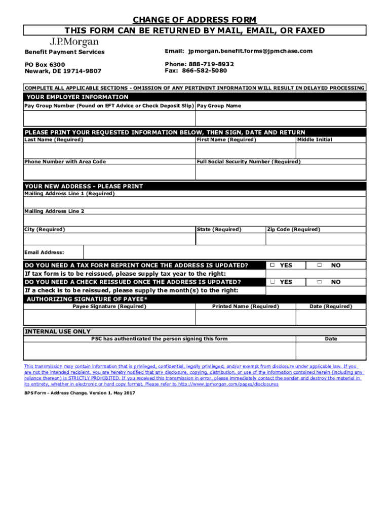 CHANGE OF ADDRESS FORM THIS FORM CAN BE RETURNED BY MAIL, EMAIL, OR FAXED Benefit Payment ServicesEmail: jpmorgan.benefit.forms@jpmchase.comPO Box 6300 Newark, DE 197149807Phone: 8887198932 Fax: 8665825080COMPLETE