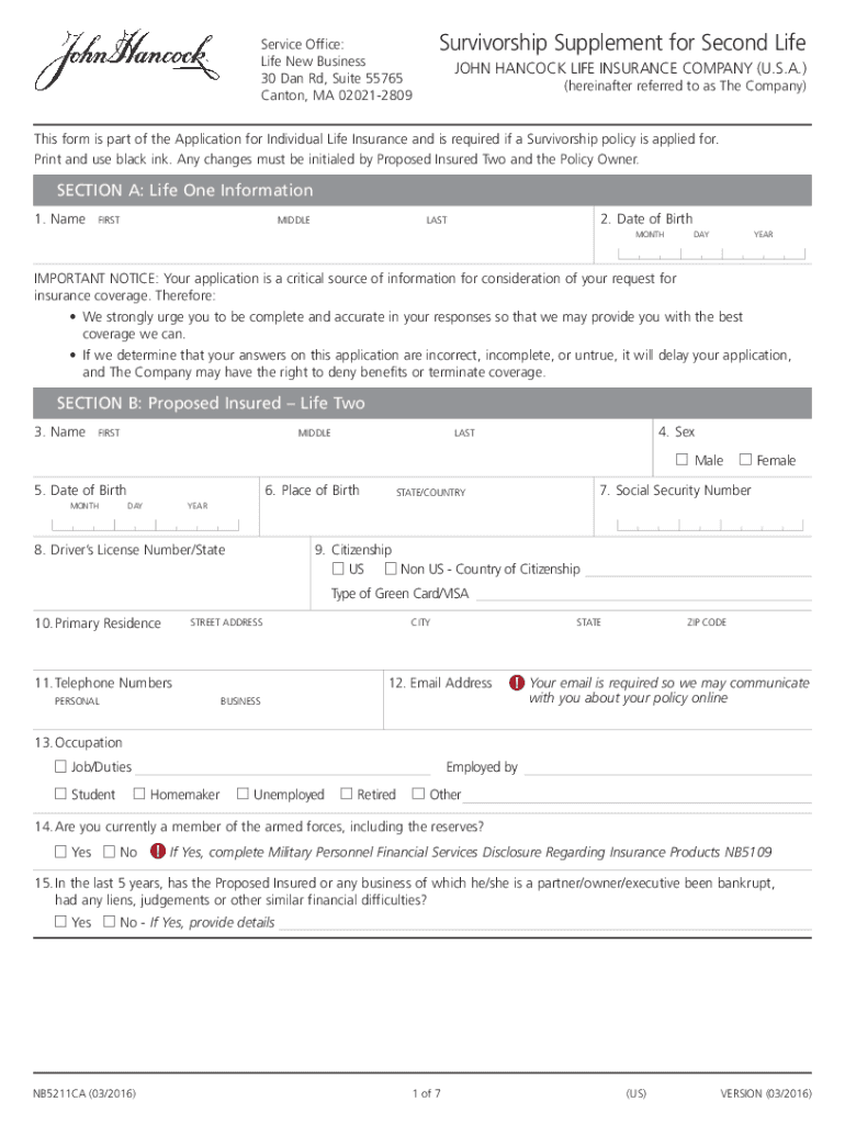 Survivorship Supplement for Second Disservice Office: Life New Business 30 Dan Rd, Suite 55765 Canton, MA 020212809JOHN HANCOCK LIFE INSURANCE COMPANY (U.S.A.) (hereinafter referred to as The Company)This