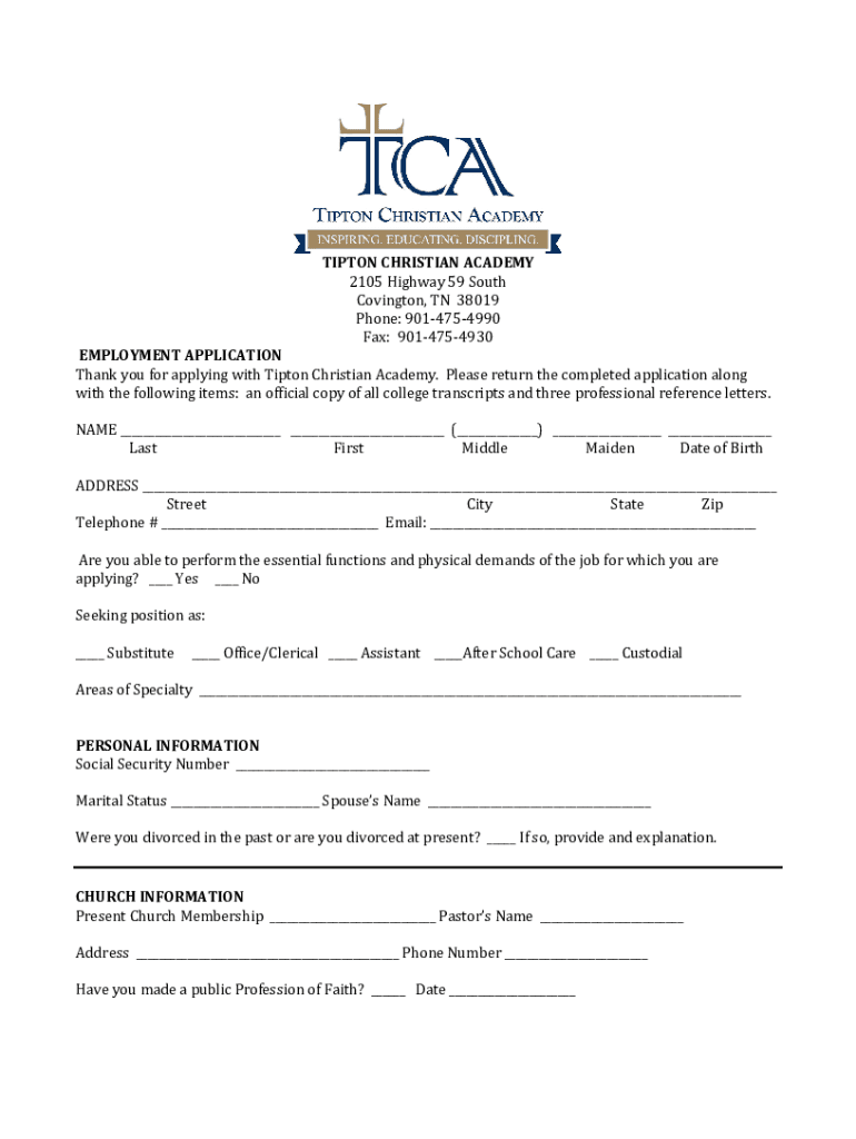 Get the free Tipton Christian Academy - Teacher Employment Application