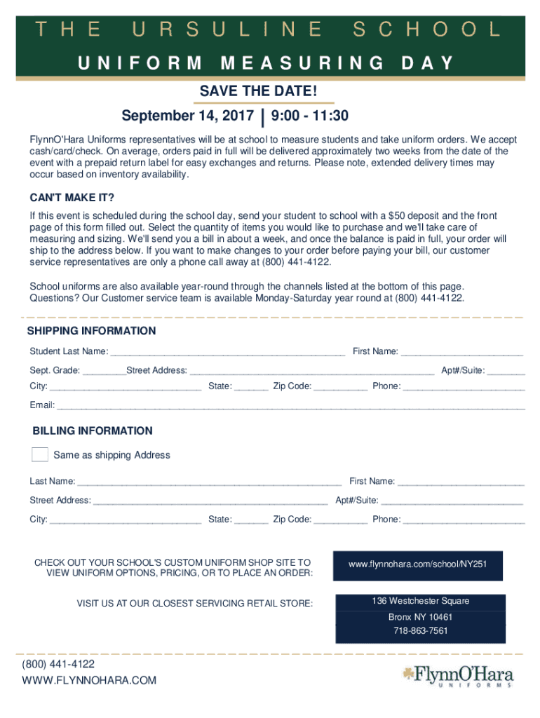 T H EU R S U L I NE UNIFORMS C H O LMEASURINGDAYSAVE THE DATE! September 14, 20179:00 11:30FlynnO\'Hara Uniforms representatives will be at school to measure students and take uniform orders. We accept