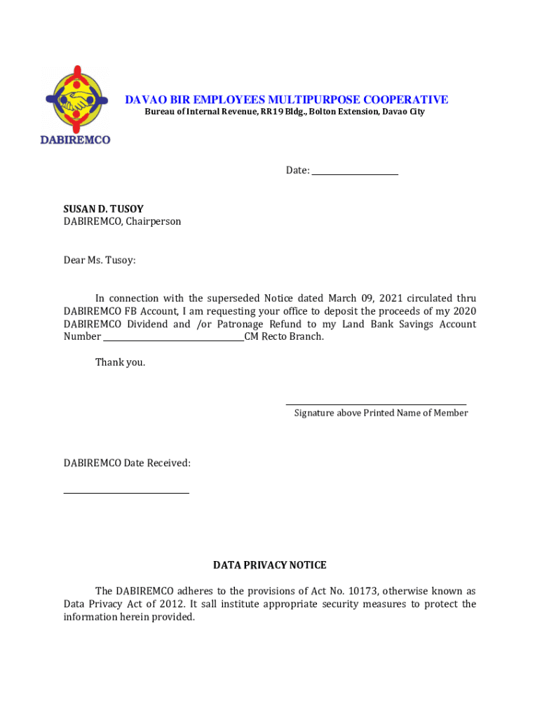 DAVAO BIR EMPLOYEES MULTIPURPOSE COOPERATIVE Bureau of Internal Revenue, RR19 Bldg., Bolton Extension, Davao Citrate: ___ SUSAN D. BUSY DABIREMCO, Chairperson Dear Ms. Tu soy: In connection with the
