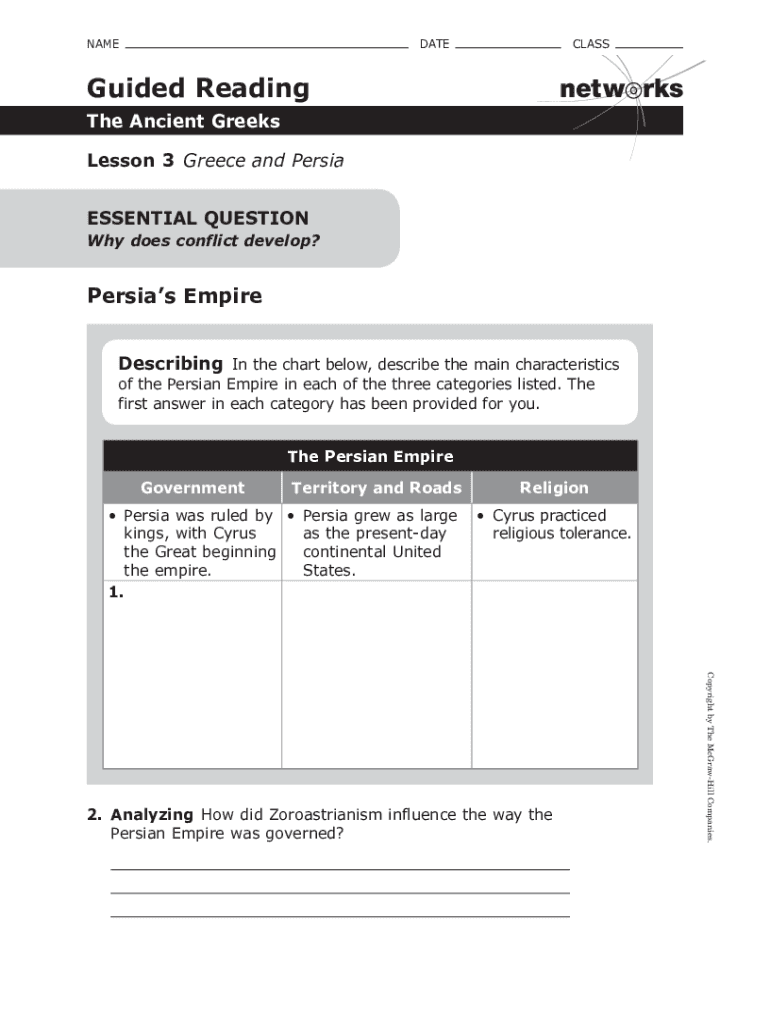 NAME DATE Classified Readingnetw rustle Ancient Greeks Lesson 3 Greece and Persia ESSENTIAL QUESTION Why does conflict develop? Persia's Empire Describing In the chart below, describe the main characteristics