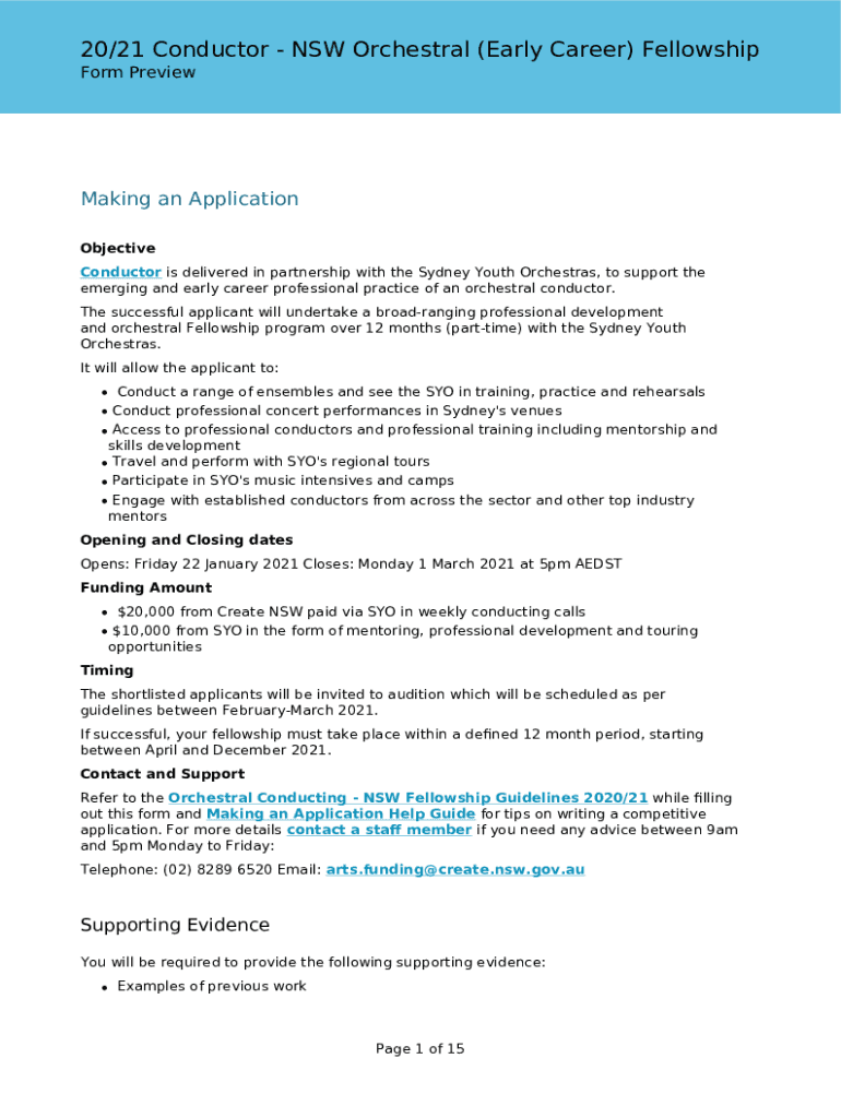 20/21 Conductor NSW Orchestral (Early Career) Fellowship Form Previewing an Application Objective Conductor is delivered in partnership with the Sydney Youth Orchestras, to support the emerging and