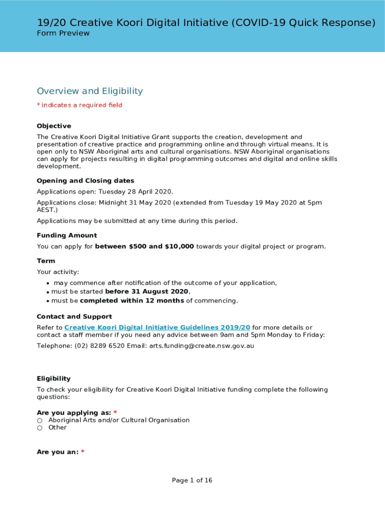 19/20 Creative Poor Digital Initiative (COVID-19 Quick Response) Form PreviewOverview and Eligibility * indicates a required ELD Objective The Creative Poor Digital Initiative Grant supports the creation,