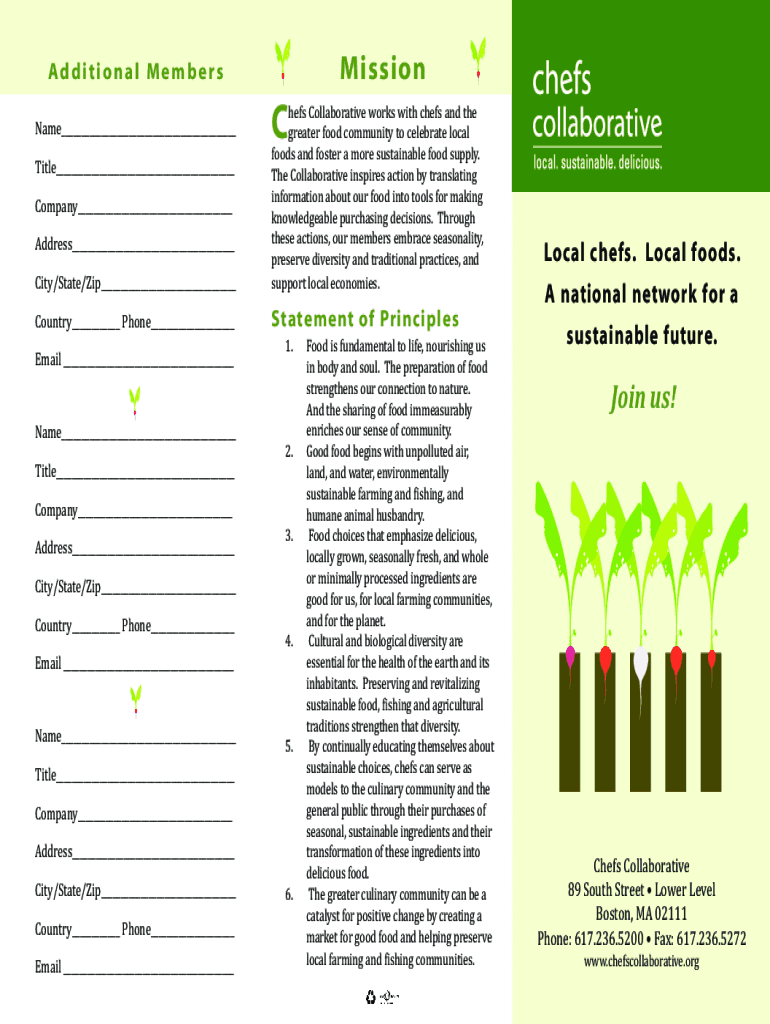MissionAdditional MembersCCity/State/Zip___chefs Collaborative works with chefs and the greater food community to celebrate local foods and foster a more sustainable food supply. The Collaborative
