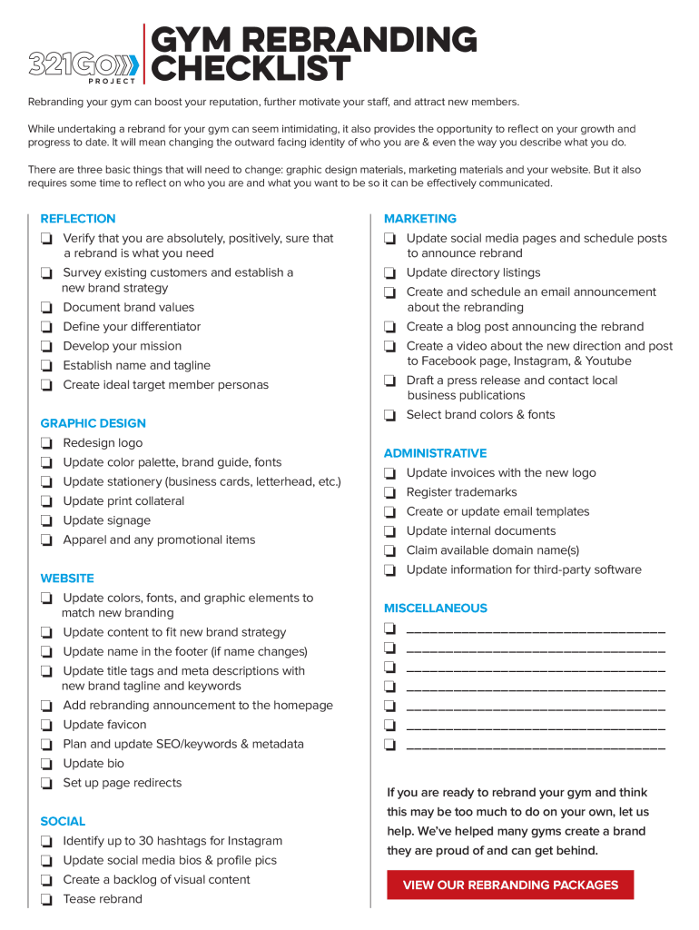 Gym Rebranding Checklist Rebranding your gym can boost your reputation, further motivate your staff, and attract new members. While undertaking a rebranding for your gym can seem intimidating, it