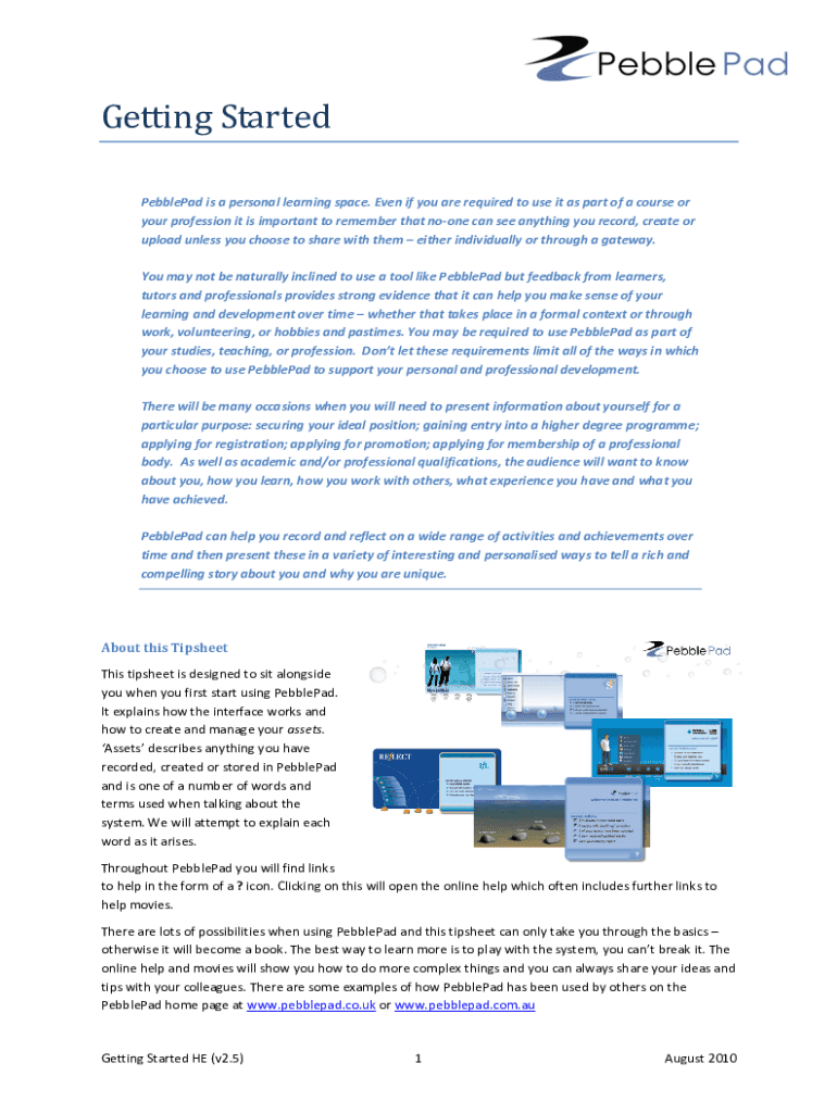 Getting Started Pebbled is a personal learning space. Even if you are required to use it as part of a course or your profession it is important to remember that none can see anything you record, create