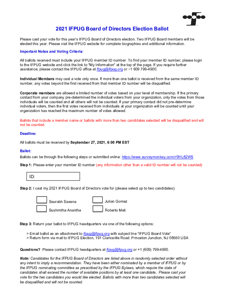2021 IF PUG Board of Directors Election Ballot Please cast your vote for this year's IF PUG Board of Directors election. Two IF PUG Board members will be elected this year. Please visit the IF PUG