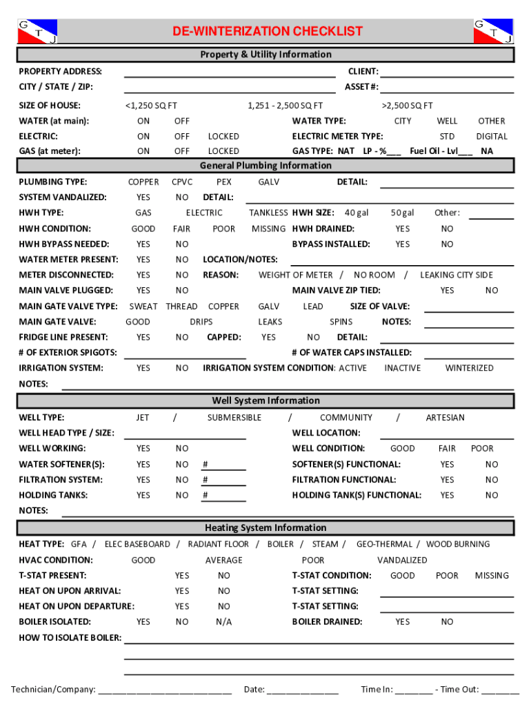 WINTERIZATION CHECKLIST Property & Utility Information PROPERTY ADDRESS:CLIENT:CITY / STATE / ZIP: SIZE OF HOUSE:ASSET #: 1,250 SQ FT1,251 2,500 SQ FTW ATER (at main):NONELECTRIC: GAS (at meter):ON
